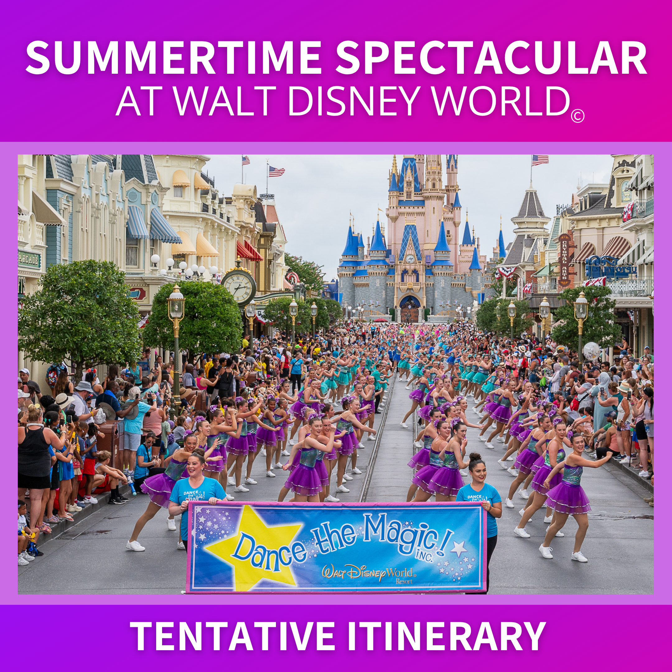 Parade at Magic Kingdom Park: Before the parade performance, dancers will work with our Dance the Magic Team in dress rehearsals to add a touch of Disney magic to the routine. Dancers will also have a professional photo shoot!