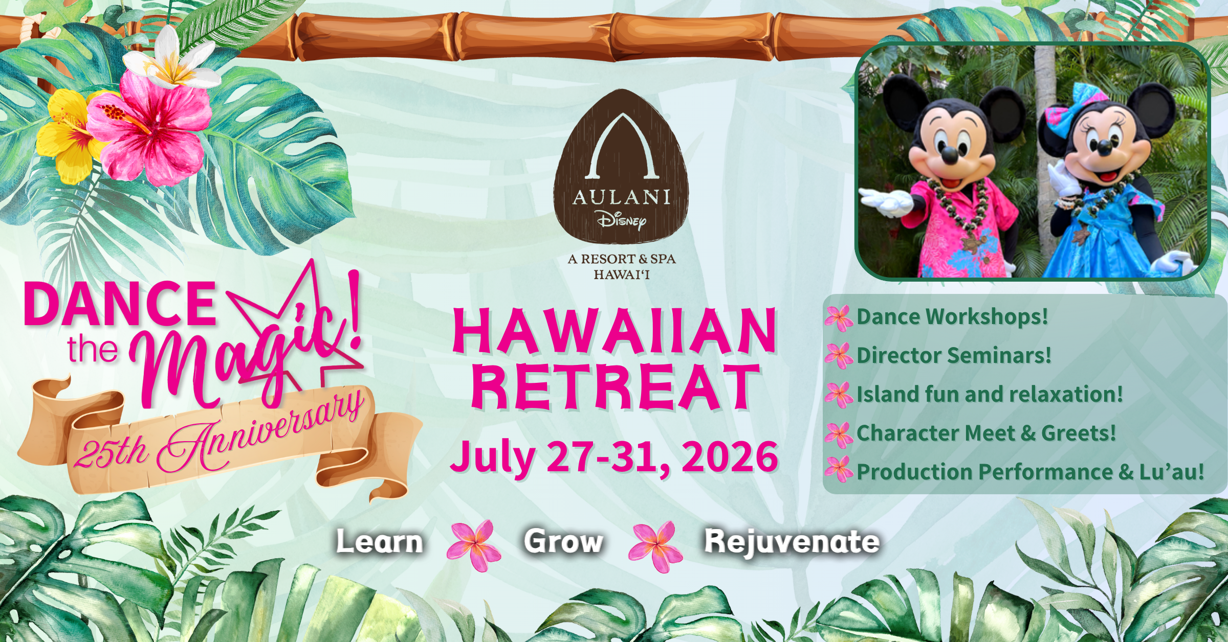 Dance the Magic invites you to learn, grow, and rejuvenate at our exclusive Hawaiian Retreat at Aulani, a Disney Resort and Spa. We’ve planned a truly special event filled with Hawaiian-inspired customs, enchanting entertainment and energizing learning opportunities! Immerse yourself in the festive atmosphere that celebrates the values we hold dear: community, meaningful connection, and gratitude. Together, we believe we can achieve great things and grow in ways that will make a lasting impact on Studio Owners, Directors, Tour Operators, Dancers, and their Dance Families.